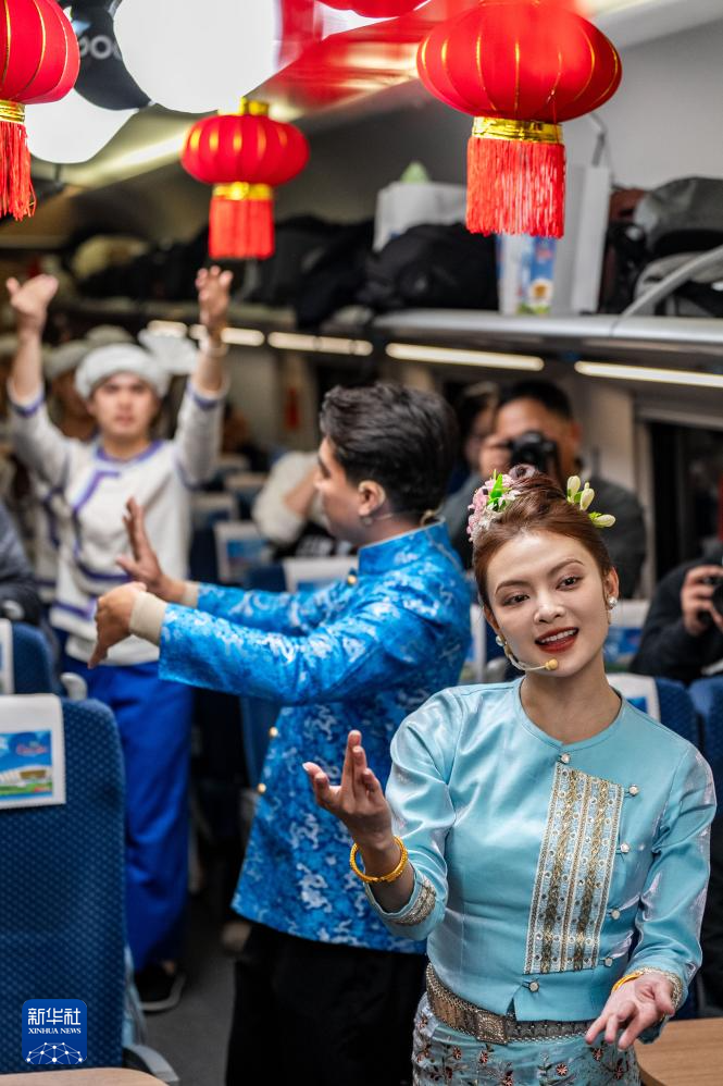 1月14日,西双版纳州民族文化工作团的演员在D87次中老铁路国际旅客列车上表演节目。新华社记者 胡超 摄