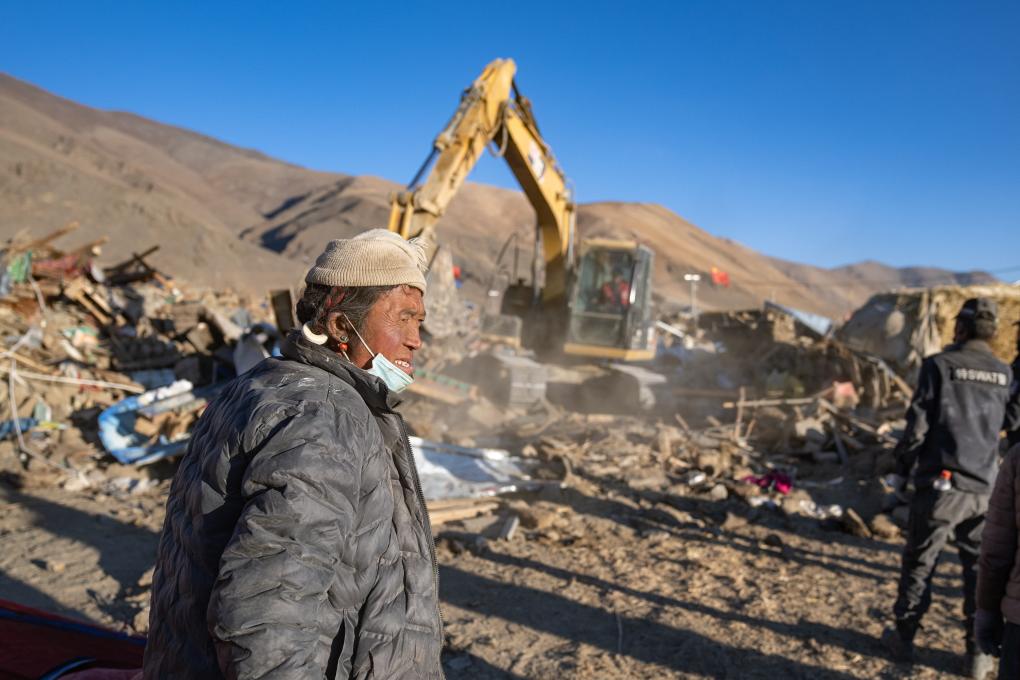 1月13日,在定日县长所乡古荣村,次仁扎西老人站在自家的废墟前。新华社记者丁增尼达 摄