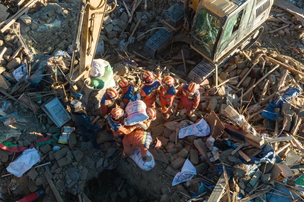 1月13日,在定日县长所乡古荣村,消防员们在搬运从废墟中抢救出的青稞(无人机照片)。新华社记者丁增尼达 摄
