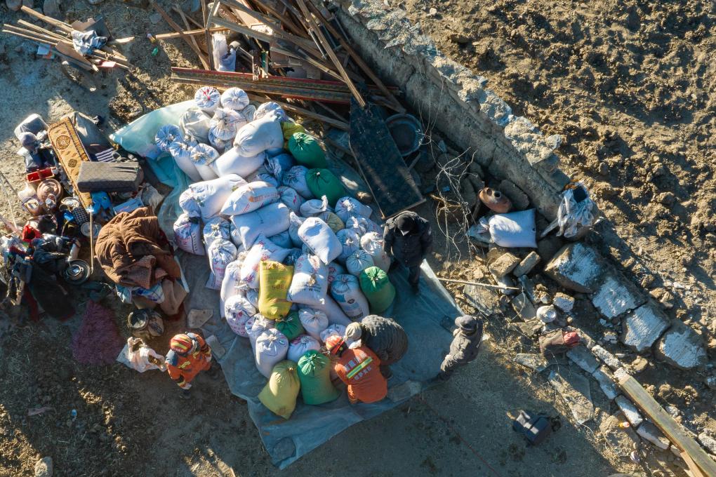 1月13日,在定日县长所乡古荣村,消防员们在整理从废墟中抢救出的青稞(无人机照片)。新华社记者丁增尼达 摄