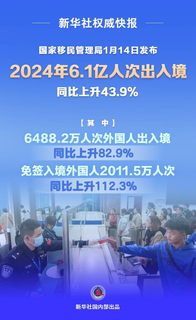 新华社北京1月14日电(记者任沁沁)2024年,全国移民管理机构累计查验出入境人员6.1亿人次,同比上升43.9%;其中内地居民2.91亿人次、港澳台居民2.54亿人次、外国人6488.2万人次,同比分别上升41.3%、38.8%、82.9%。全国各口岸免签入境外国人2011.5万人次,同比上升112.3%。