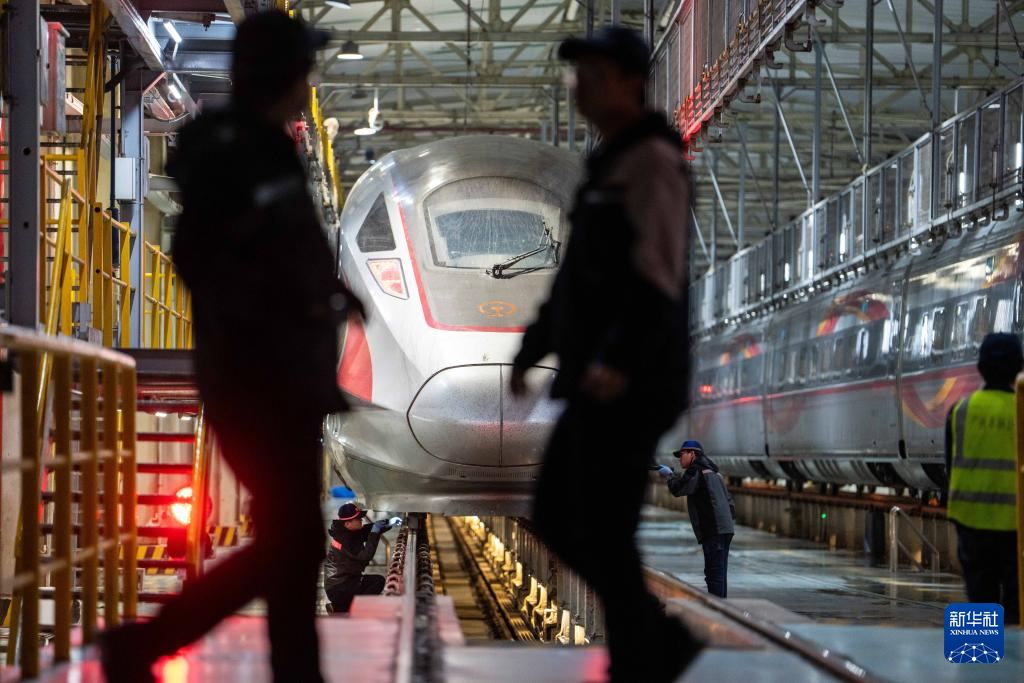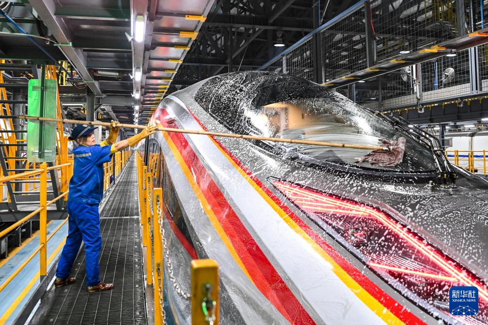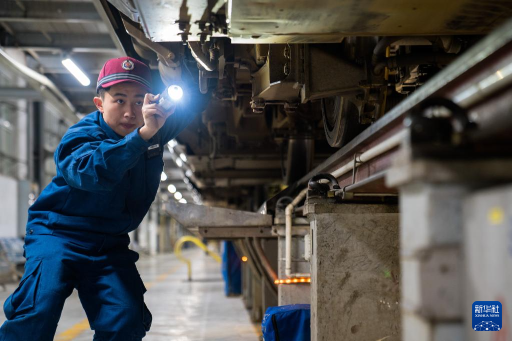 1月14日,2025年春运开启。各地铁路部门对列车进行维护、清洁、保养,确保春运期间列车运行安全。