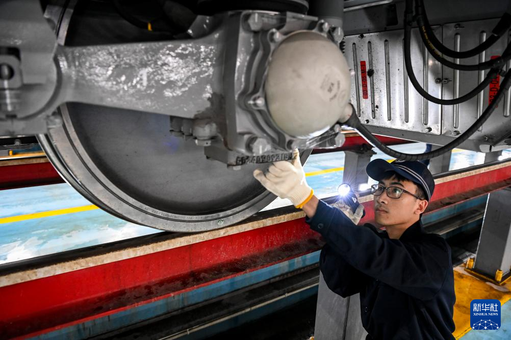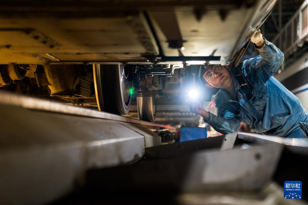 1月14日,在中国铁路南宁局集团有限公司南宁车辆段南宁动车所,地勤机械师对动车走行部进行检查。