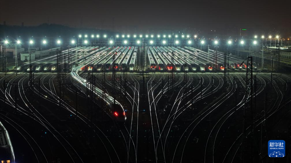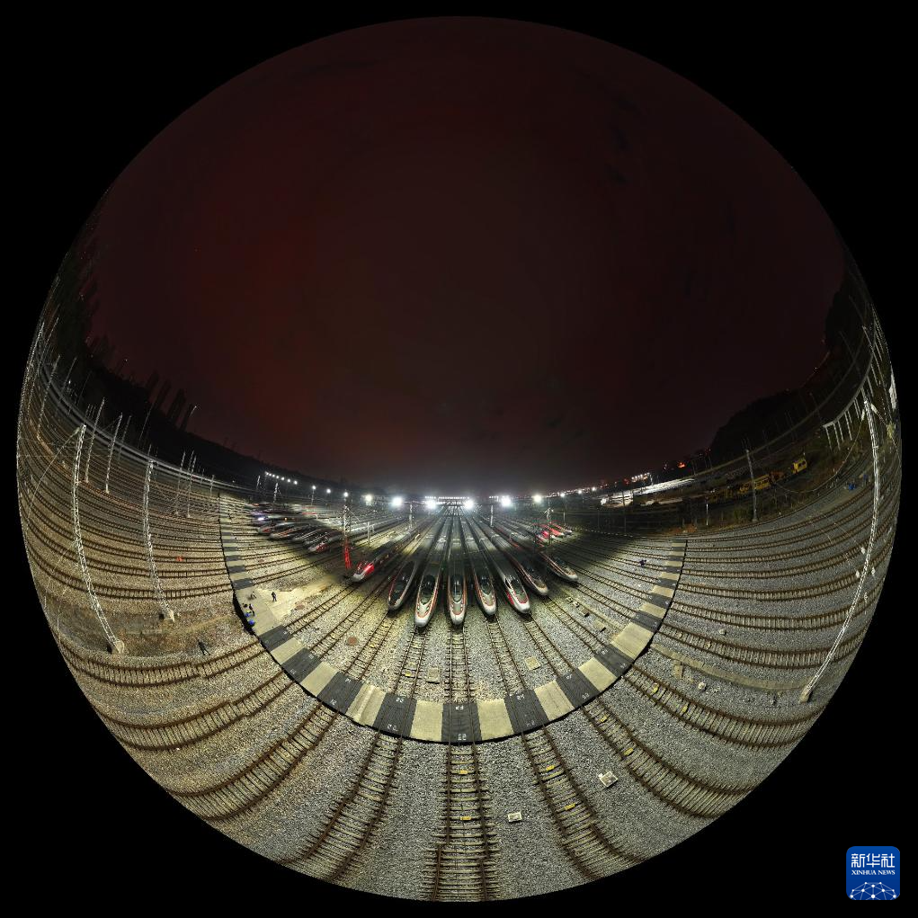 1月14日凌晨,多辆动车组列车停放在长沙动车运用所整装待发(无人机全景照片)。