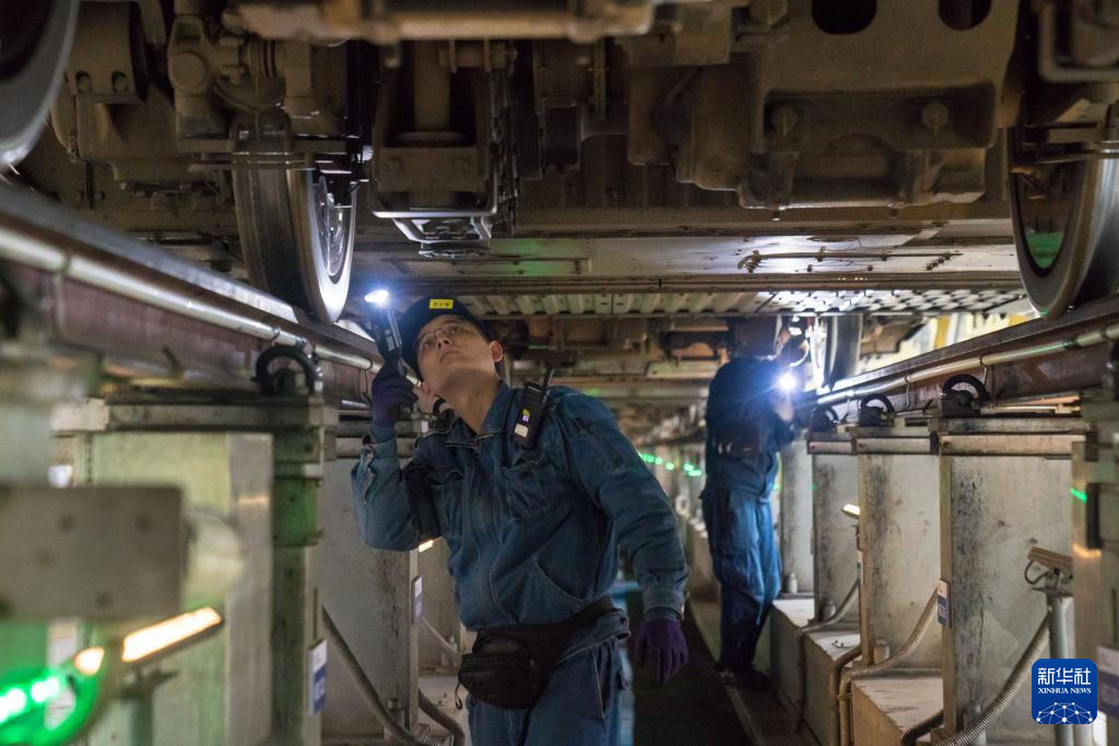 1月13日晚,中国铁路昆明局集团有限公司昆明车辆段动车所地勤机械师开展检修工作。