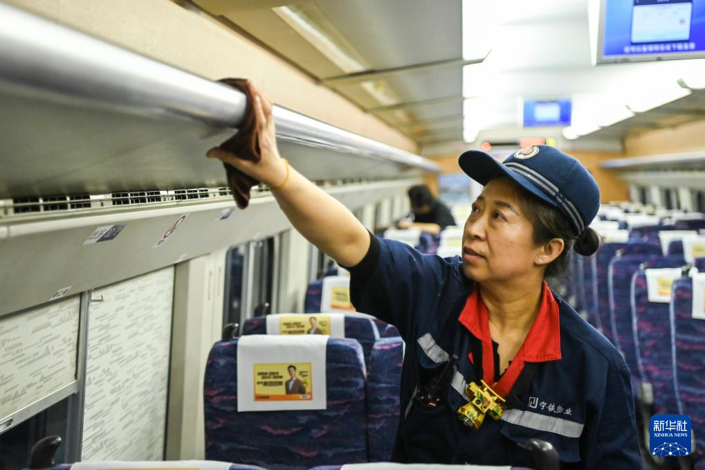 1月14日,在中国铁路南宁局集团有限公司南宁车辆段南宁动车所,工作人员对车内进行清洁。