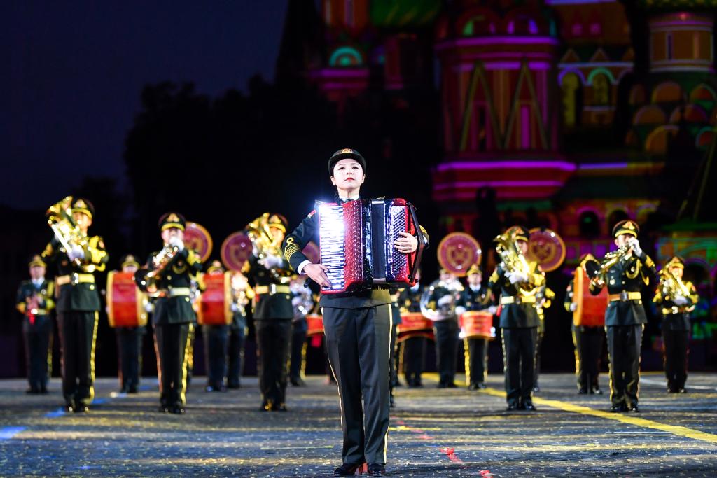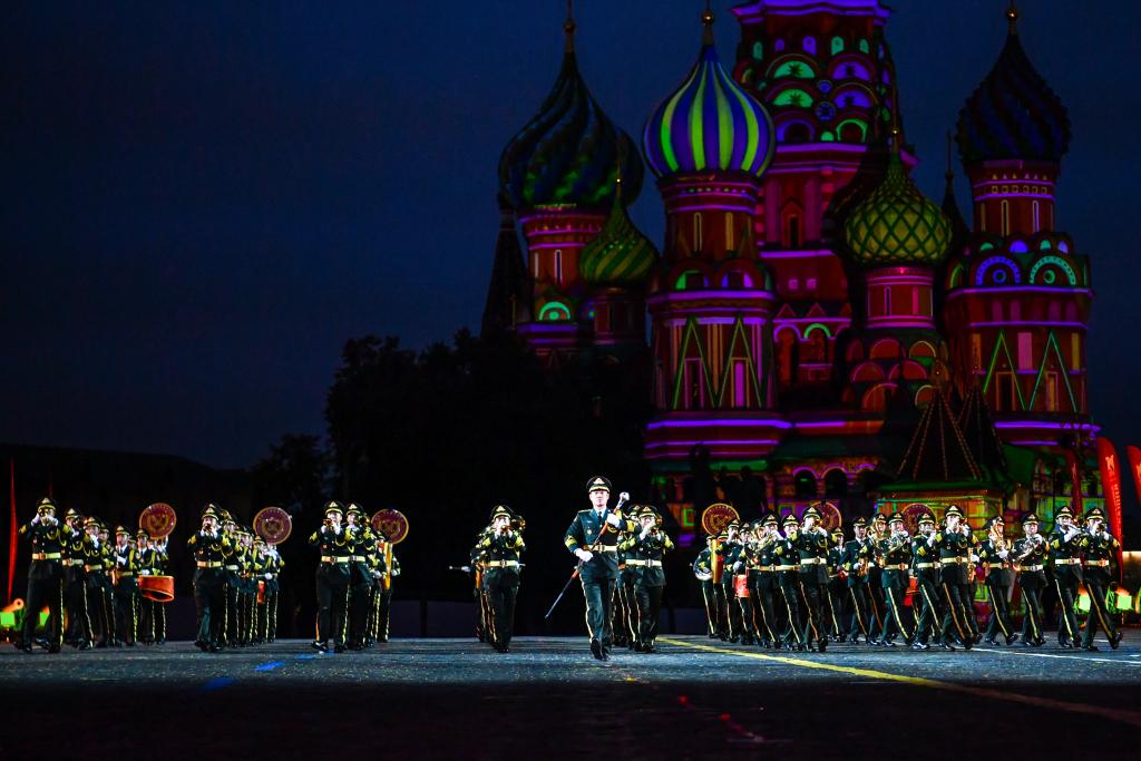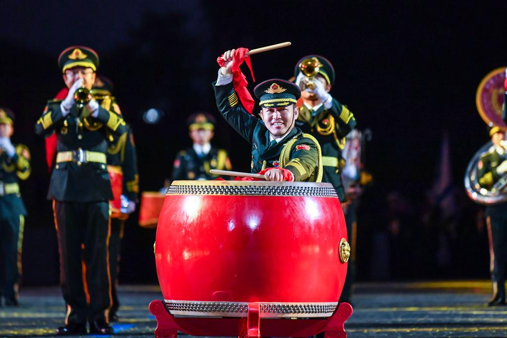 2024年8月23日,在俄罗斯首都莫斯科,中国人民解放军仪仗司礼大队军乐团在军乐节上表演。