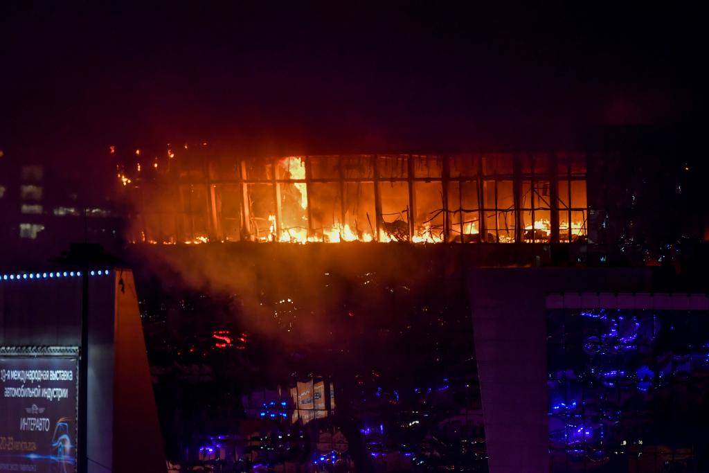 2024年3月22日,俄罗斯莫斯科近郊克拉斯诺戈尔斯克市一音乐厅发生枪击事件后引发火灾。