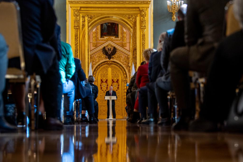 在媒体休息室、茶歇室、三次安检室等待若干小时后,记者们被带进了一个金碧辉煌的宫殿。我跟着一位相熟的塔斯社同行抢到不错的位置,脚还没站稳,他“啪”一声趴在了地上,也邀请我一起趴下,这个角度的确能拍出好照片。