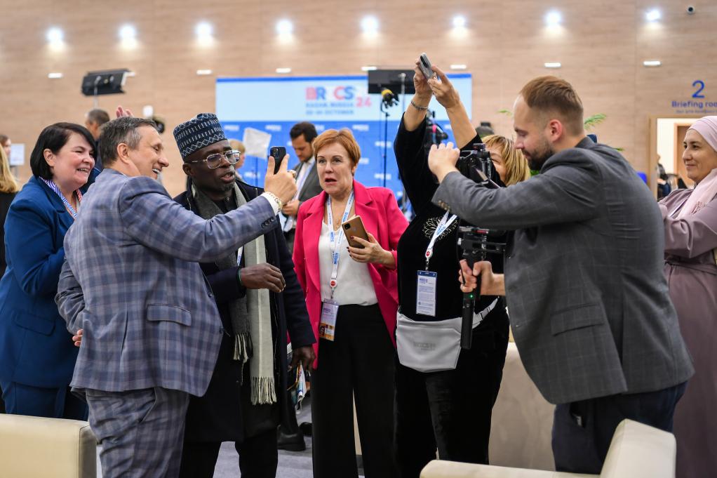 2024年10月22日,媒体工作人员在俄罗斯喀山金砖峰会新闻中心工作。