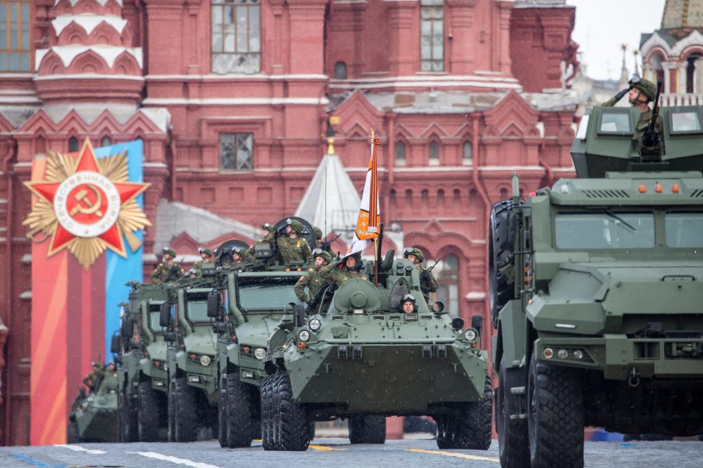 2024年5月9日,在俄罗斯首都莫斯科,军车编队驶过红场。