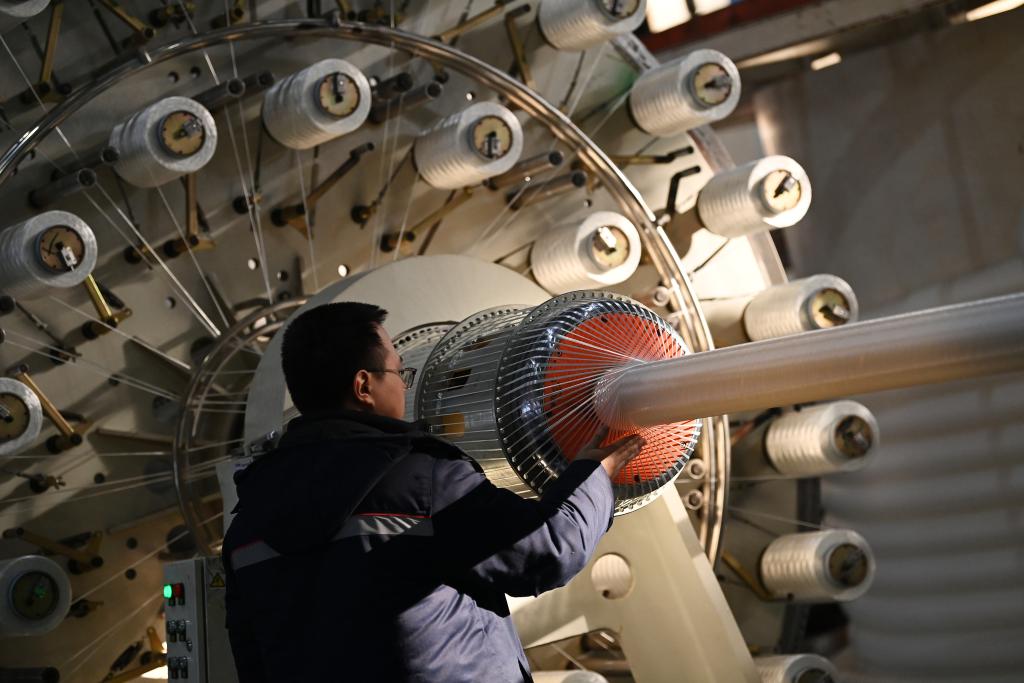 1月7日,在陕西宝鸡天联汇通复合材料有限公司生产车间,工人查看柔性复合高压输送连续管设备运转情况。( 新华社记者 李一博 摄)