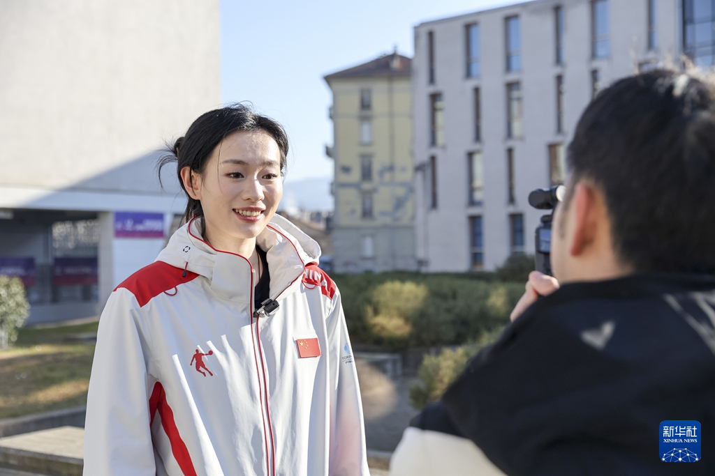 1月13日,中国代表团开幕式旗手、来自北京体育大学的女子冰壶队运动员裴君杭接受采访。新华社记者 李京 摄