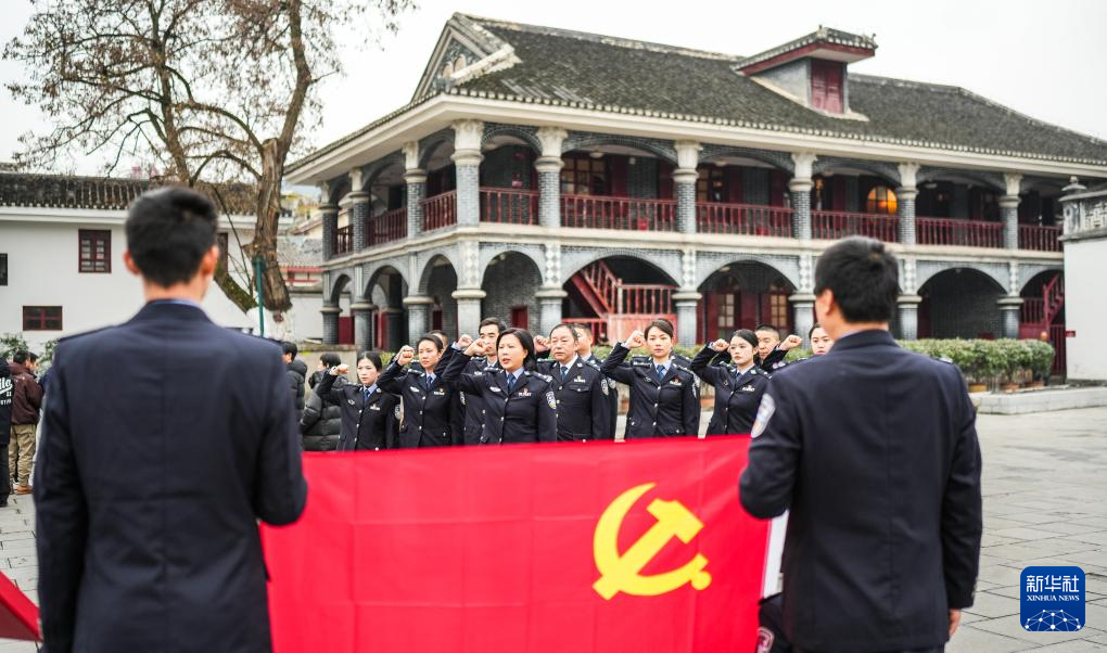 基层民警在遵义会议会址前重温入党誓词(2025年1月7日摄)。新华社记者 陶亮 摄