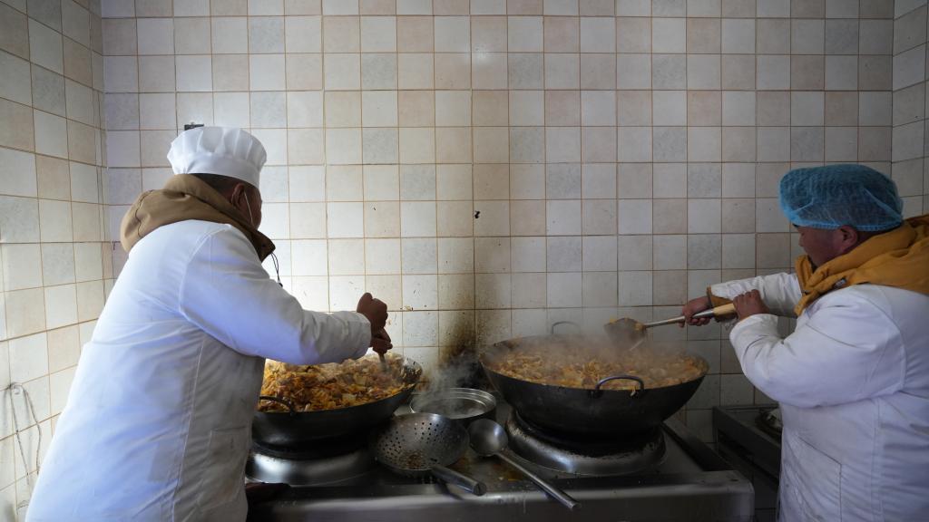 “前天午饭是萝卜炖排骨,昨天是土豆红烧肉。”扎西说,每天菜品都不重样。