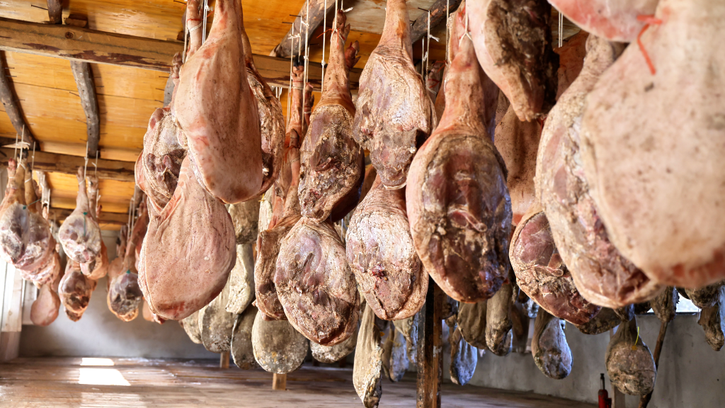 这种“火腿银行”,其实是火腿代挂房。它们往往依山而建,凭借冷凉气候等优势,为每只腌制好的火腿提供专属的发酵空间。经过一年甚至更久时间的风吹日晒,火腿味道变得愈发纯正。期间,房间要保持通风,为避免苍蝇蚊虫侵扰,窗户还得加装一道纱窗。