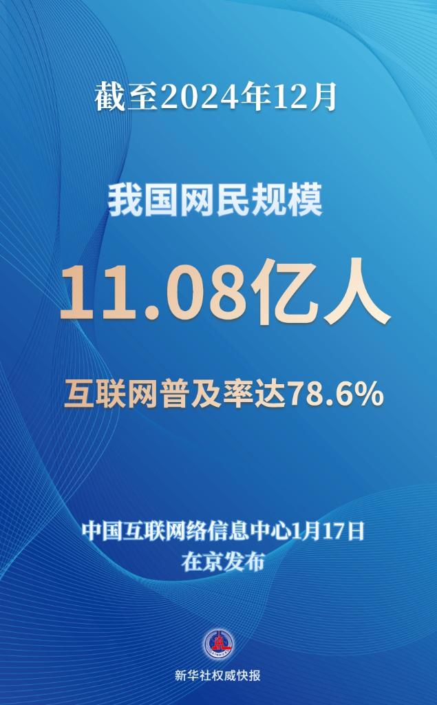 中国互联网络信息中心1月17日在京发布第55次《中国互联网络发展状况统计报告》。报告显示,截至2024年12月,我国网民规模达11.08亿人,较2023年12月增长1608万人,互联网普及率达78.6%。