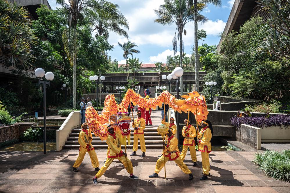 2024年1月31日,内罗毕大学孔子学院学生在位于肯尼亚首都内罗毕的联合国环境规划署总部表演舞龙。