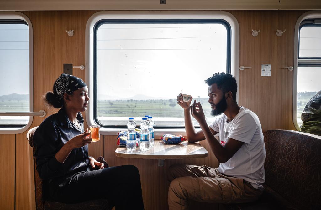 2023年9月9日,乘客在亚吉铁路列车的餐车内交谈。