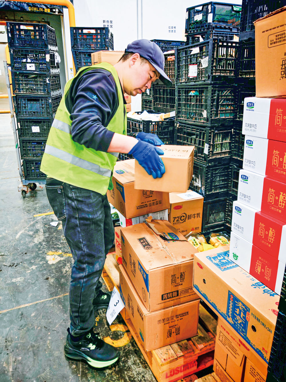 晚9点,记者来到东六环外一处大型物流仓库,数千平方米的空间里,牛奶、蔬菜、水果、面包、熟食、零食等各自堆成小山。这处物流集散地24小时连轴转,进京货物先运至此,分拣后再发往各地。