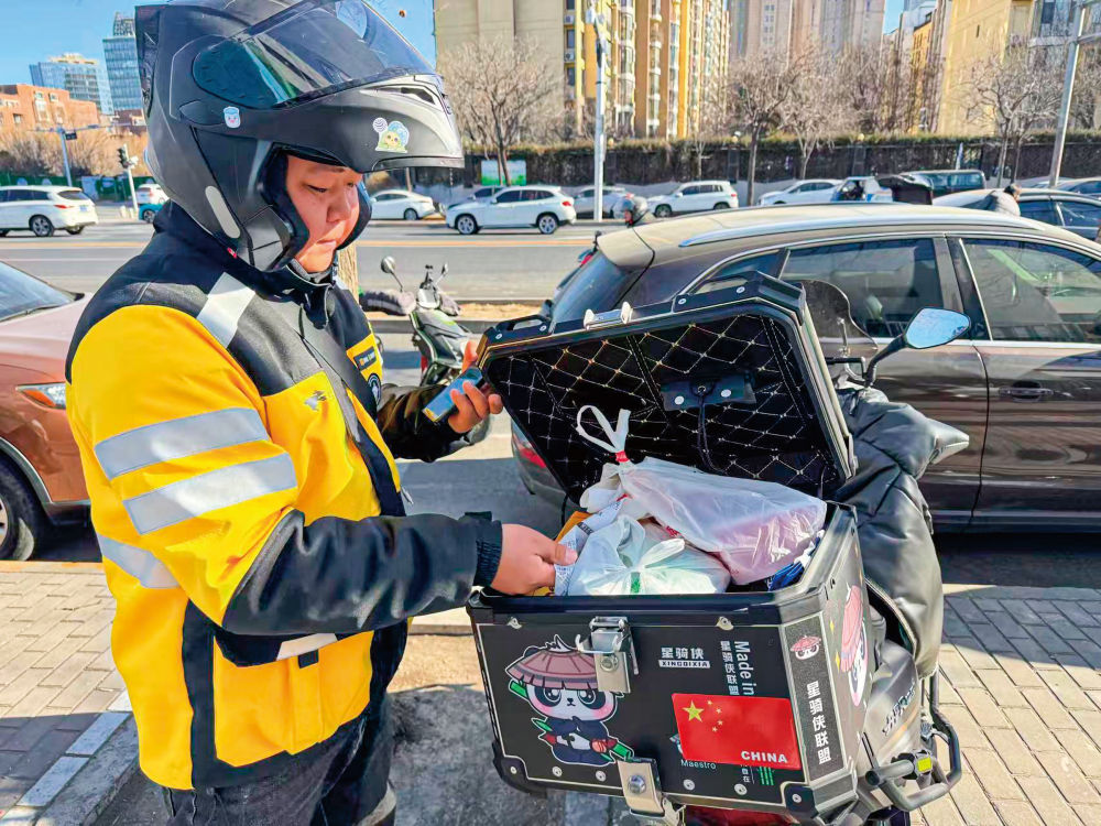 骑手刘建查看餐品情况。新华每日电讯记者郭宇靖摄