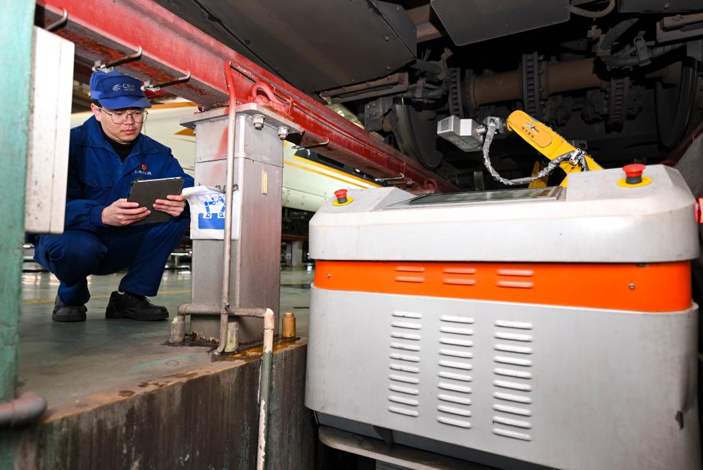 1月16日,在上海动车段虹桥动车运用所,地勤机械师对库内检修机器人的作业结果进行校验复核。