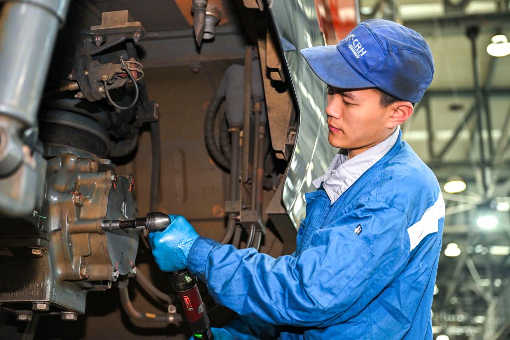 1月16日,在上海动车段虹桥动车运用所,地勤机械师使用智能扭矩扳手自动对动车组轴端螺栓进行检修。
