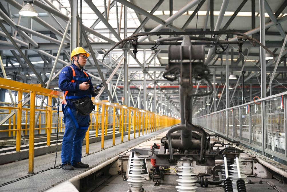 1月16日,在上海动车段虹桥动车运用所,地勤机械师对动车组受电弓进行升弓试验。