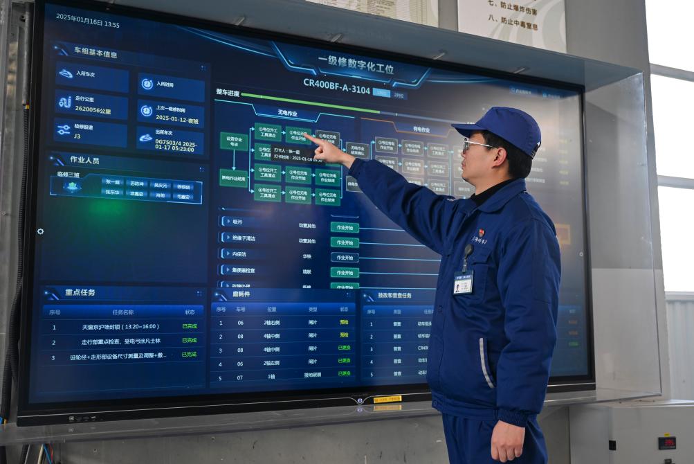 1月16日,在上海动车段虹桥动车运用所,工长在操作一级修数字化工位界面。