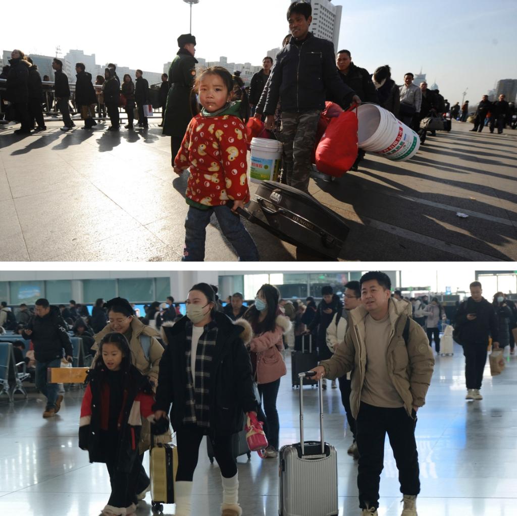 拼版照片。上图为:2011年1月25日,在太原火车站,来自安徽的小女孩钟媛媛和父母一起回家(新华社记者燕雁摄);下图为:2025年1月18日,在太原南站,旅客踏上回家路(新华社记者王学涛摄)。新华社发
