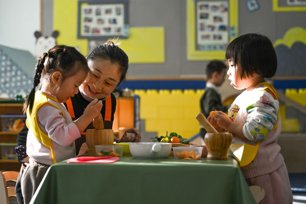 在青海省西宁市城中区一家托育中心,老师带孩子们体验劳动课程(2024年12月12日摄)。 新华社记者 张龙 摄