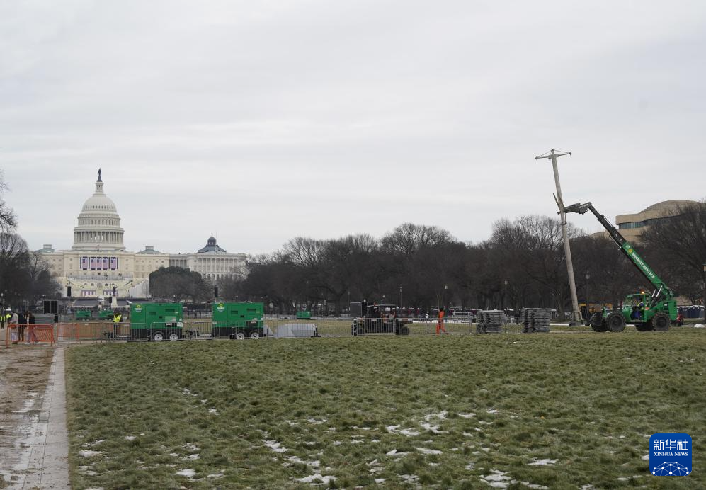 1月18日,在美国首都华盛顿,工作人员拆除在国会大厦外为观礼准备的设施。新华社记者 吴晓凌 摄