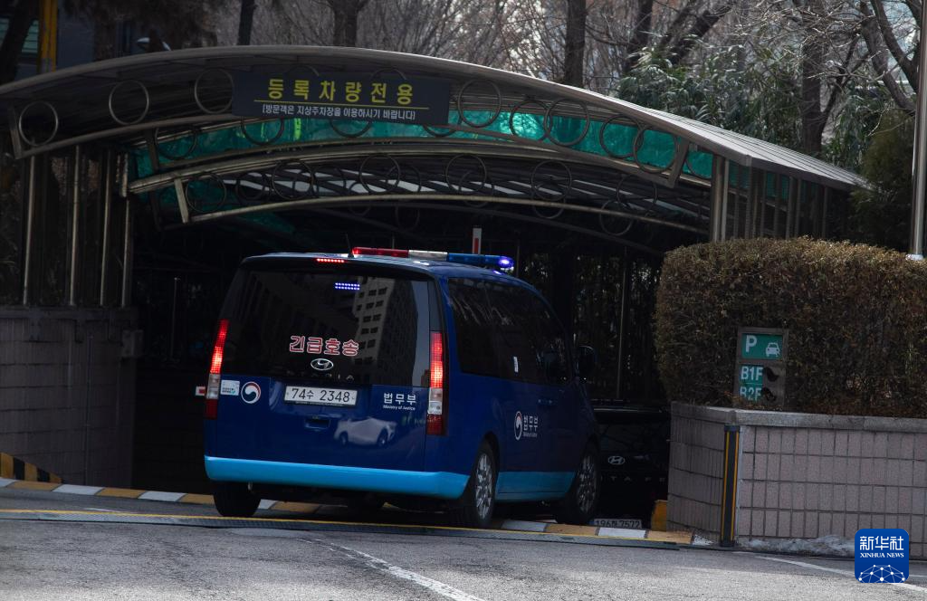 1月18日,尹锡悦乘坐的蓝色车辆驶离韩国首尔西部地方法院。新华社发(全休相摄)