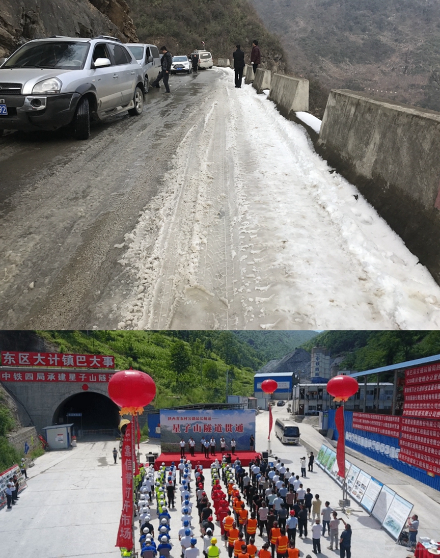 这是一张拼版照片。上图为:2018年1月17日,记者新春走基层,从镇巴县城前往兴隆镇采访的路上(新华社记者 沈虹冰 摄);下图为:2022年6月28日,镇巴县城前往兴隆镇的星子山隧道顺利贯通(镇巴县委宣传部供图)。