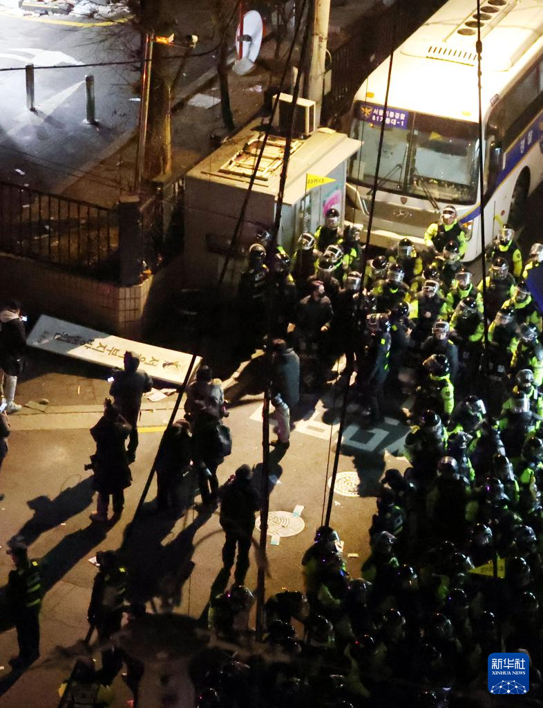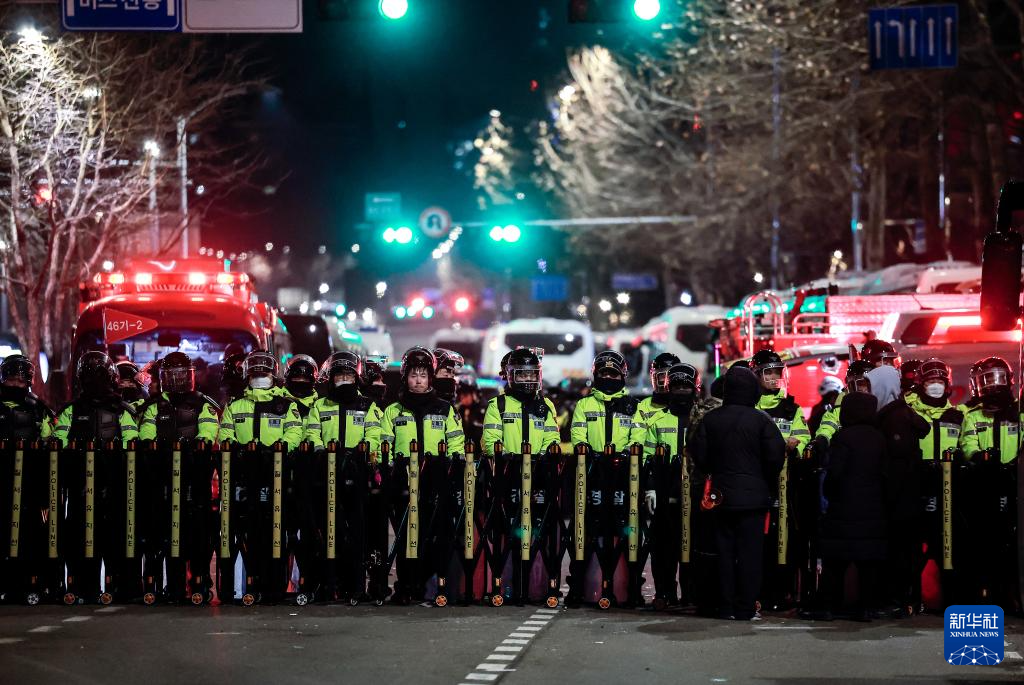1月19日,韩国警察在首尔西部地方法院附近维持秩序。新华社/纽西斯通讯社