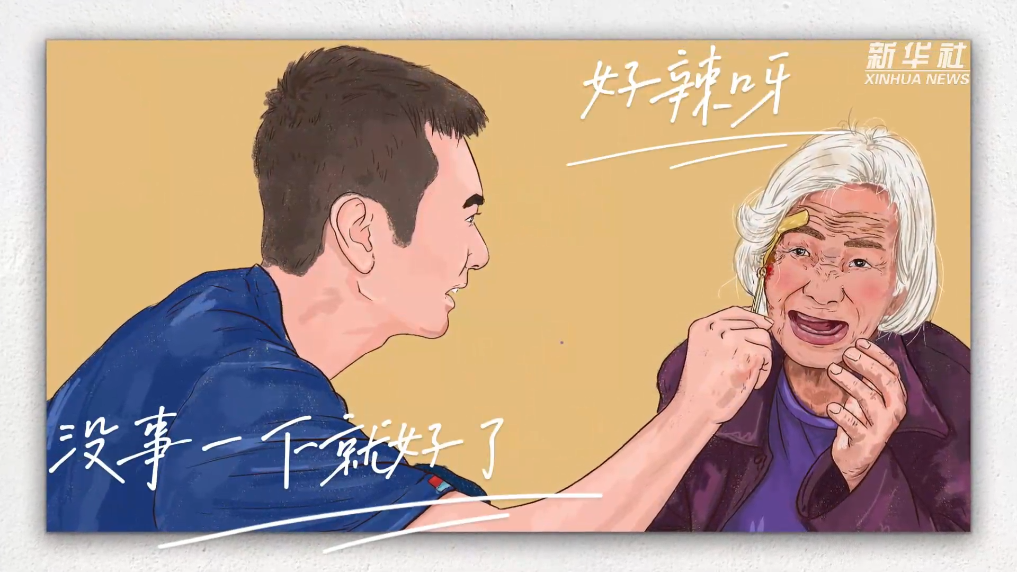 消防员归队途中帮助摔倒老奶奶,用棉签轻轻擦拭伤口消毒。
