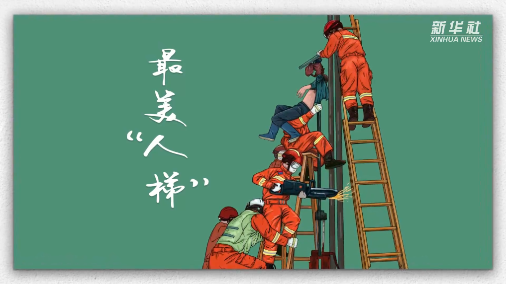 因操作失误,一名工人被卡在打井机上,多名消防员组成“人梯”搭救被困人员。