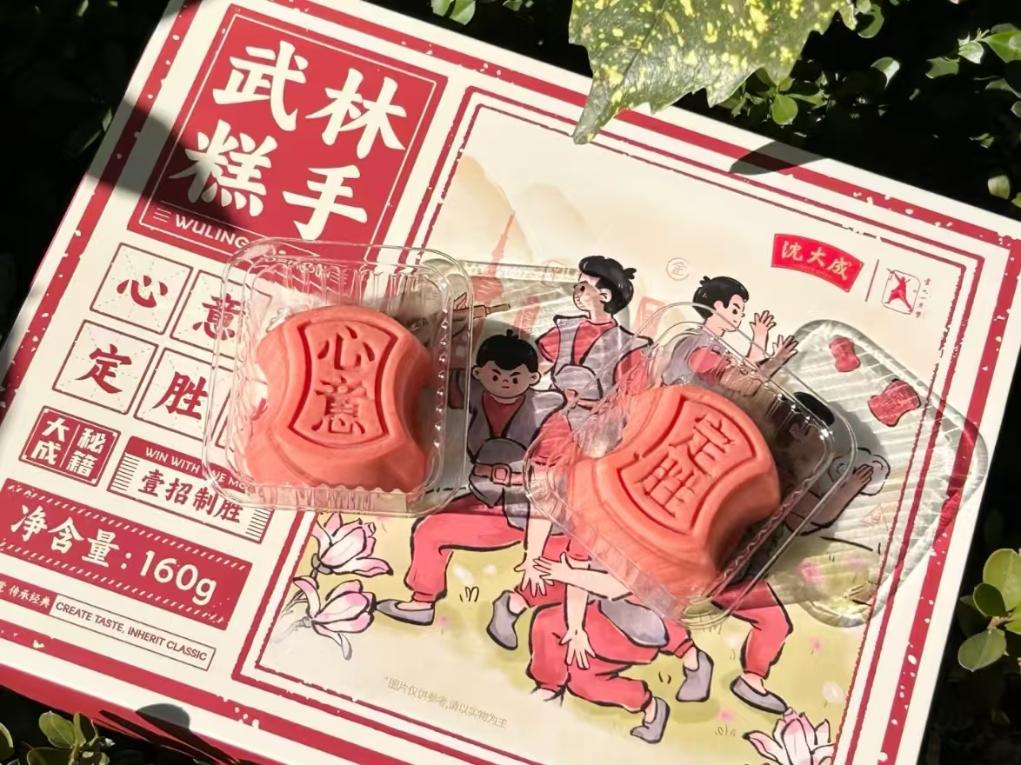 非遗传承人们也不再满足于“守住老味道”,更在努力跨界融合、推陈出新。沈大成最新推出的“武林糕手”心意定胜糕,内里仍是银锭造型、香甜软糯的糕点,外包装设计则引入了国家级非遗项目卢氏心意拳的招式形象,受到消费者的欢迎。