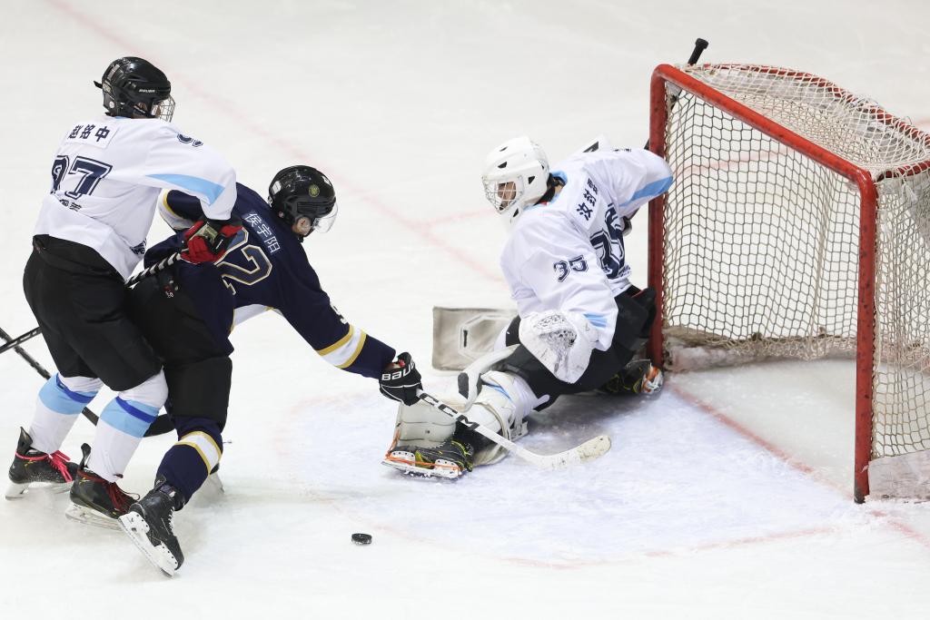2024年12月8日,北京京狮男子冰球队球员侯宇阳(中)在2024-2025赛季中国男子冰球职业联赛(齐齐哈尔站)比赛中射门。新华社记者 张涛 摄