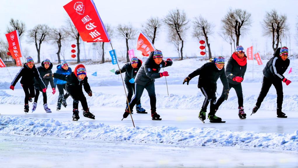 在黑龙江省齐齐哈尔市,青少年在户外冰场训练滑冰。