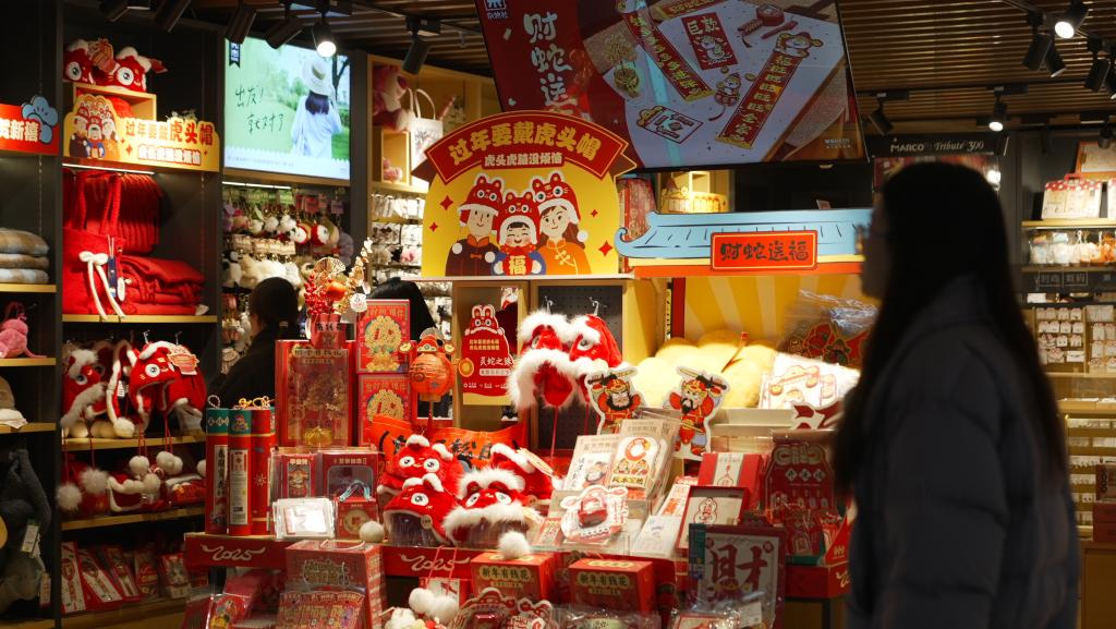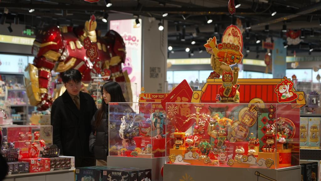 “闲来逛市场,年货尽琳琅。”吃食是年味,装饰是彩头,年货市场红红火火。在江西南昌一商超内,购置年货的消费者人头攒动。不远处一家潮玩店也是门庭若市,店内潮流人偶戴上“财神帽”,颗粒拼装的积木花蕊在枝头绽放,舞狮、锦鲤、招财猫等节日“使者”稳居C位……
