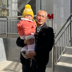 2025年1月18日,柴永忠抱着小孙子在新房前合影。新华社记者张文静 摄