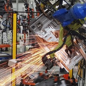 2024年12月23日,在江苏省江都高新技术产业开发区一家汽车制造企业,工业机器人在进行焊接作业(无人机照片)。新华社发(孟德龙摄)