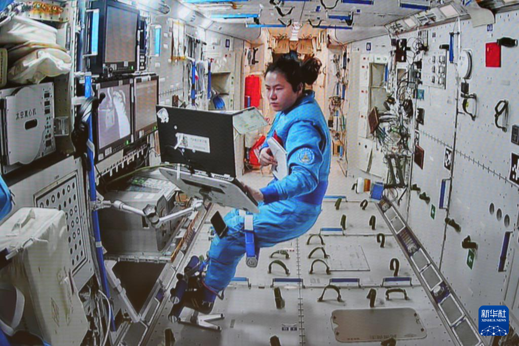 1月20日在北京航天飞行控制中心拍摄的神舟十九号航天员王浩泽在空间站组合体舱内协同工作的画面。新华社记者 刘芳 摄