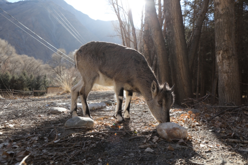 时至中午,暖阳下三只岩羊在管护站门前休憩进食,看到护林员走近后也没避开。护林员们伸手抚摸,如见老友。
