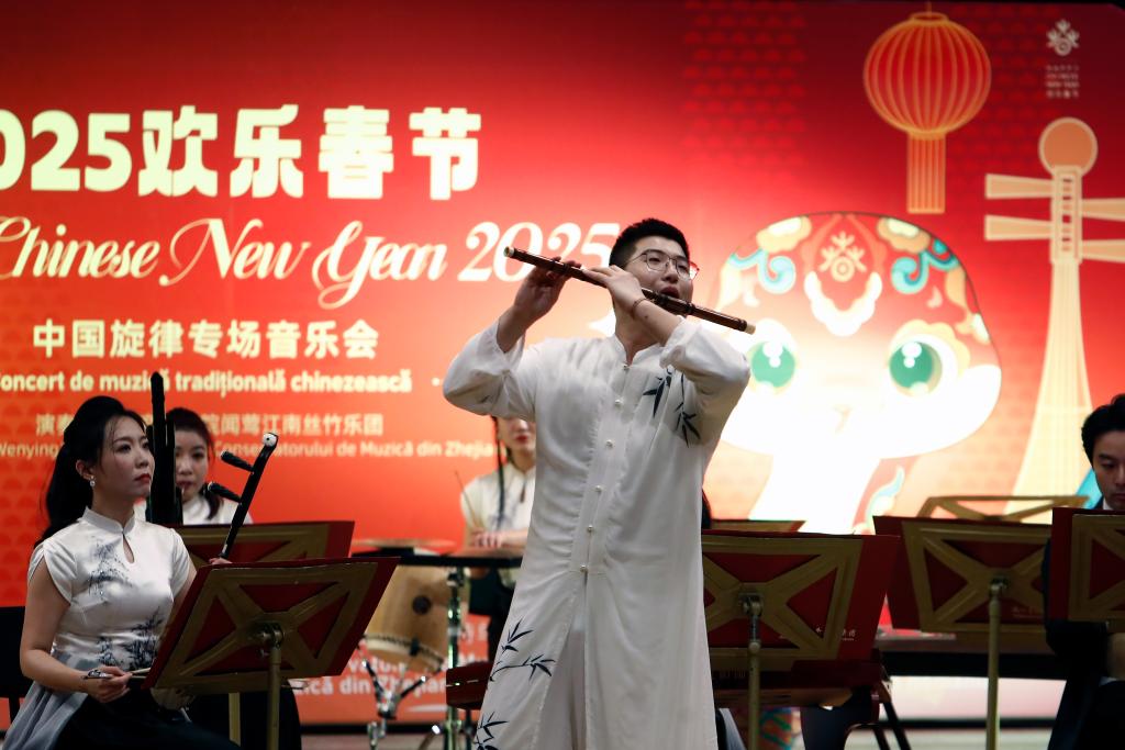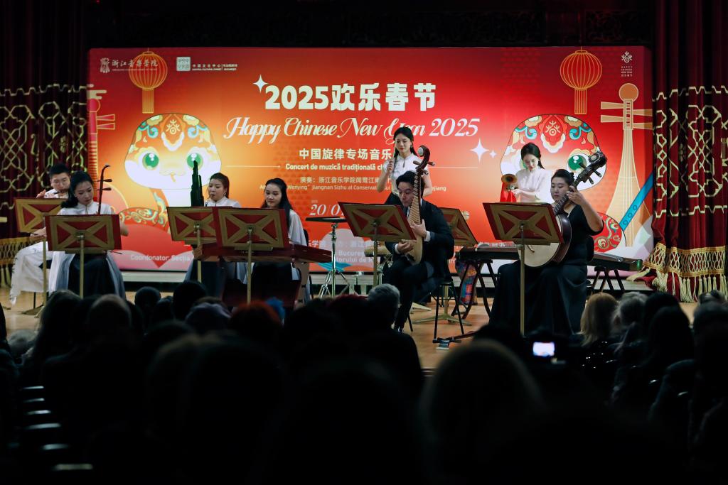 1月20日,在罗马尼亚首都布加勒斯特的雅典娜音乐厅,中国浙江音乐学院“闻莺”江南丝竹乐团成员在2025“欢乐春节”中国旋律专场音乐会上演奏乐曲。新华社发(克里斯泰尔摄)