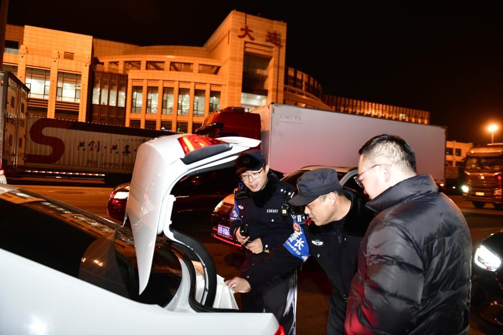 1月21日,山东省烟台市港航公安局乘务警察支队民警在大连湾客运站检查乘客汽车后备箱。新华社记者郭绪雷 摄