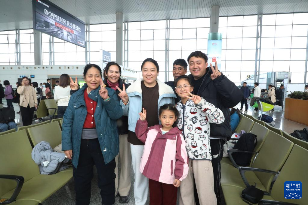 1月14日,斯郎伦珠一家人在广州白云机场候机时合影。新华社记者 田建川 摄