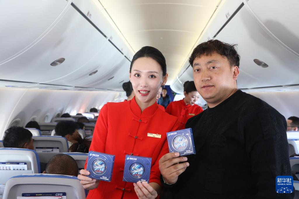 1月14日,斯郎伦珠在南航CZ8233航班上展示空姐为乘客赠送的C919徽章。新华社记者 田建川 摄