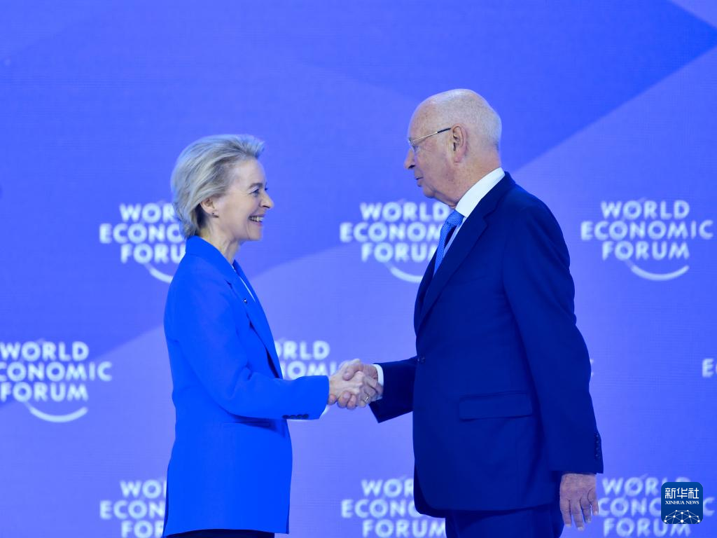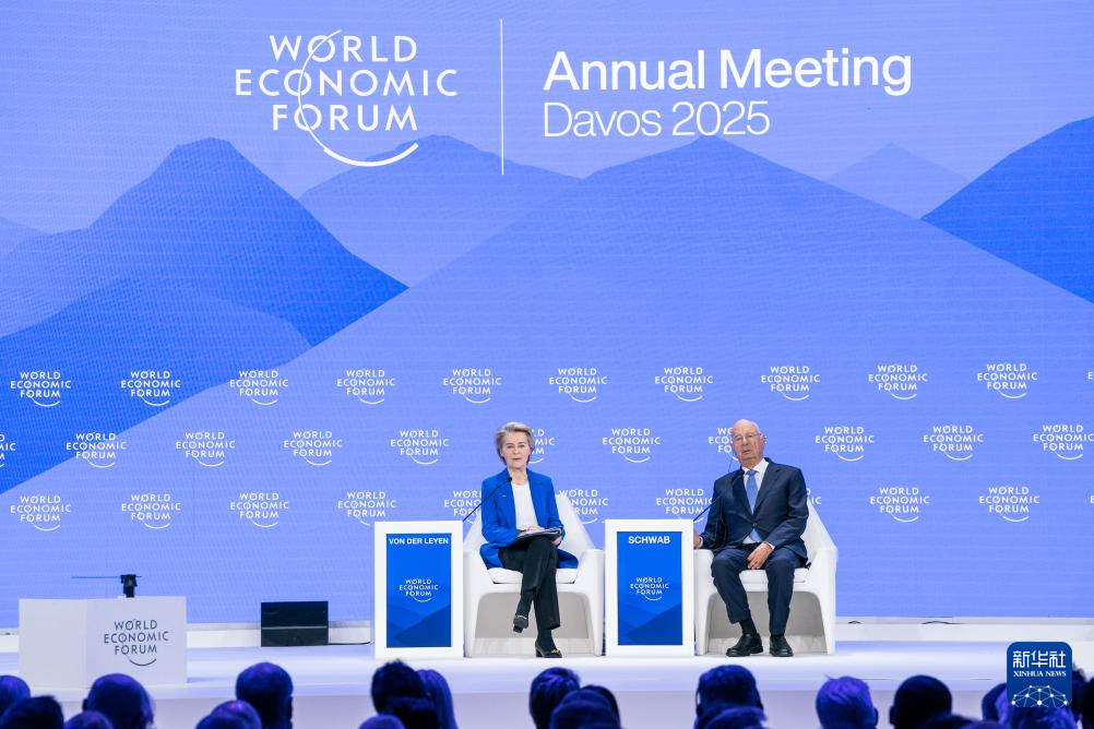 1月21日,在瑞士达沃斯,欧盟委员会主席冯德莱恩(左)与世界经济论坛创始人施瓦布参加世界经济论坛2025年年会。新华社记者 彭子洋 摄